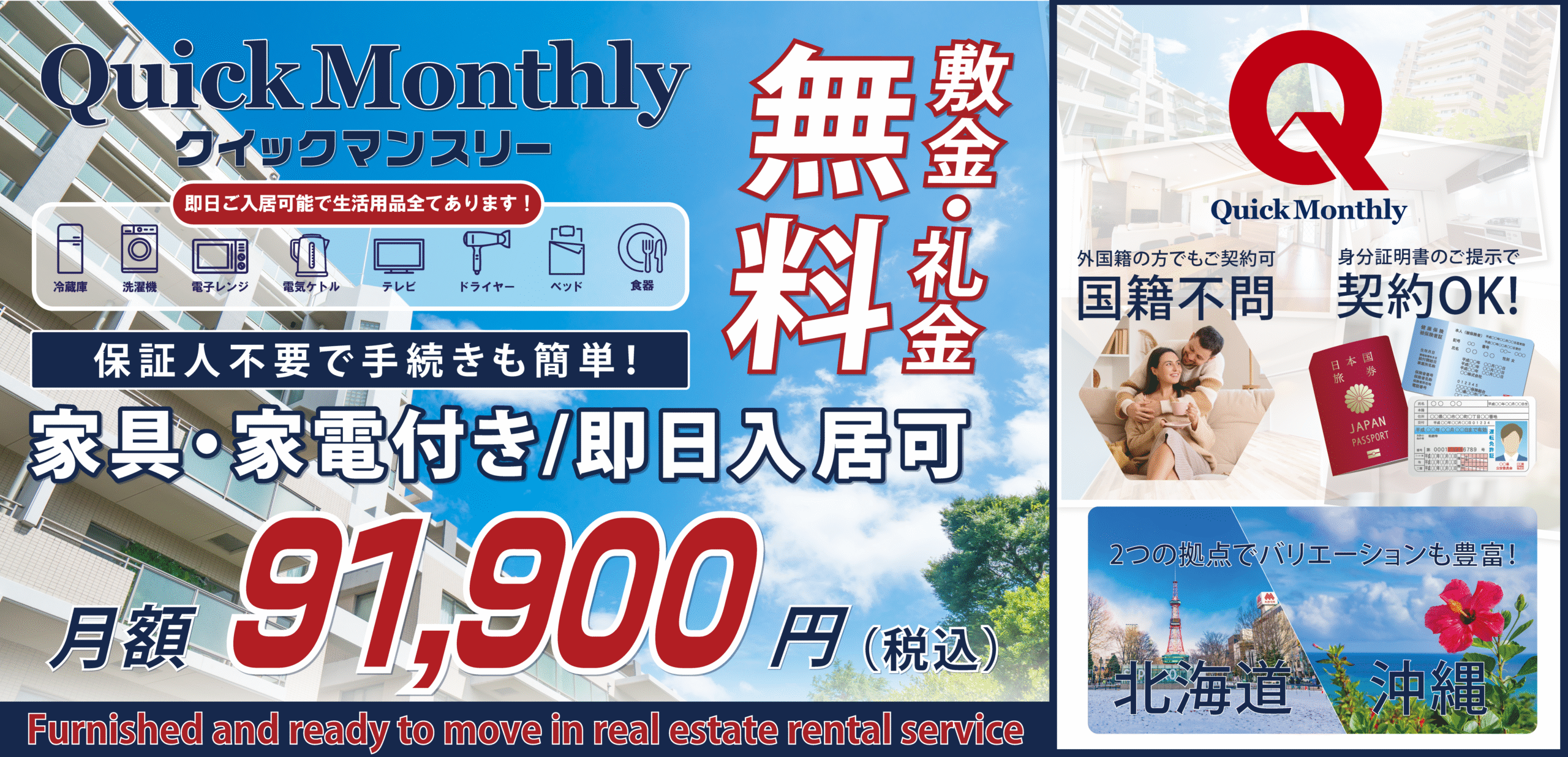 Quick Monthlyは定額制(月々91,900円)で即日ご入居可能!